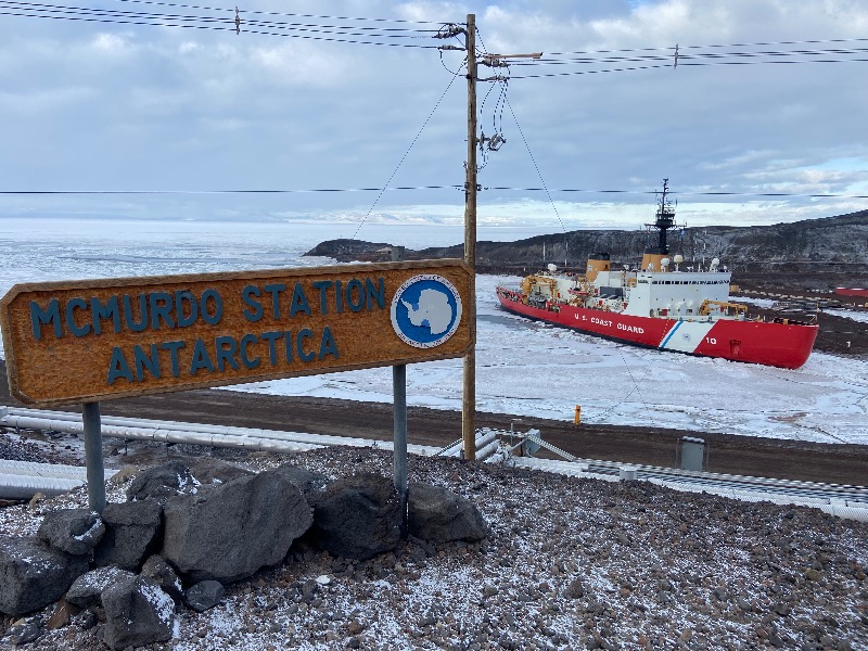 The McMurdo Station sign with the USCGC Polar Star docked at the ice pier in the background.