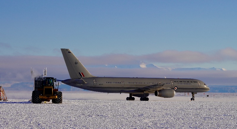 A Boeing 757-2K2 owned and operated by the Royal New Zealand Air Force (RNZAF) taxiing from the apron