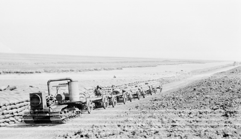 Elgin Lease. Wagon train hauling barley. Elgin wagon train. Note the Holt Forty Five with what must be a spark arrestor barrel. The smokestack vents into the barrel, maybe filled with water?