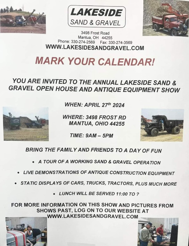 The International Watch Fob Association, Inc. presents the 60th Watch Fob, Memorabilia and Toy Show combined with Construction Equipment Memorabilia and a Live Demonstration of Vintage Construction & Mining Equipment (hosted by Larry Kotkowski - Lakeside Sand & Gravel - Mantua, Ohio) 3498 Frost Rd, Mantua, OH 44255 Join us for the 60th year of the world's largest Watch Fob and Toy Show on April 26 - 27, 2024 Friday April 26th - 9 a.m. till 5 p.m. - Free Admission - Purchase Items at the Watch Fob Show, Construction Memorabilia, Scale Models & Toy Show - See the Largest Display of Watch Fobs for Show or Sale Anywhere on Earth - Win 50/50 Raffles Throughout the Weekend - Meet and Develop Relationships with Other Collectors - Members are Entitled to Purchase Limited Edition Commemorative Watch Fob Saturday April 27th - 9 a.m. till 5 p.m. - Free Admission - Attend the Lakeside Sand & Gravel Antique Equipment Show & Open House - Watch Fob, Construction Memorabilia & Toy Show - See Construction Equipment as Old as 1910 plus antique tractors, trucks, cars, hit & miss engines, and more. - Take Gravel Pit Tours - Free Food and Refreshments - 100% of Donations go the Hattie Larlham Foundation watchfob.com/show-info watchfob.com/member-info watchfob.com/ Facebook event www.facebook.com/share/6Xm2PyM53nuU6mo4/?mibextid=9VsGKo