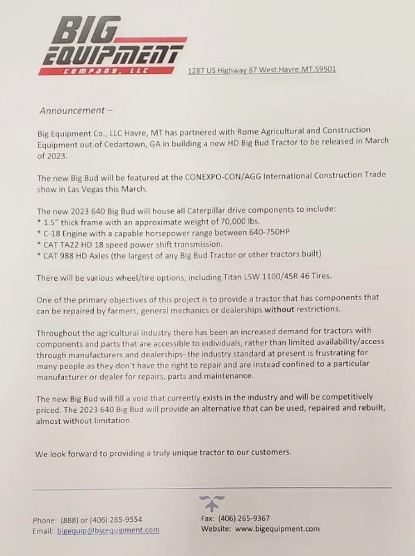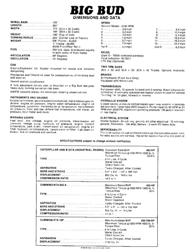 Attached is the recent press release, as well as the spec sheet from the last Big Bud offered with Cat power.